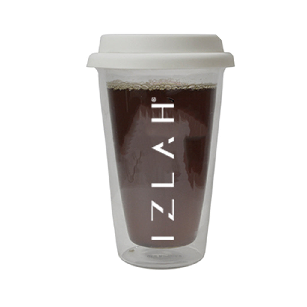 Vaso de vidrio con doble capa, cuenta con una tapa de silicón flexible que evita el derrame de tu bebida y conserva la temperatura por un tiempo mas prolongado.